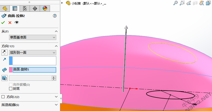 9.合适的位置建个面,或在上视面画个圆,拉伸曲面。成型到上一步的帽子上。。