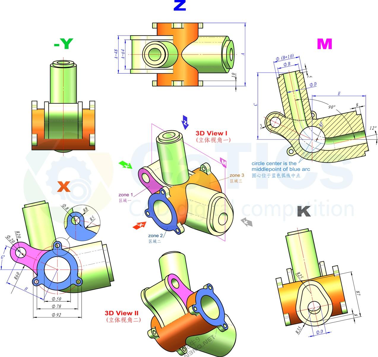 【题目】【注意】其中对称、同心等几何关系。【其他】同色短线长度相等,同色圆弧半径相同,-Y视图为半剖视图。(题图为示意图,只用于表达尺寸和几何关系,由于参数变化,其形态会有所变化。)(输入答案时请精确到小数点后两位)【参数】A=110 &n...