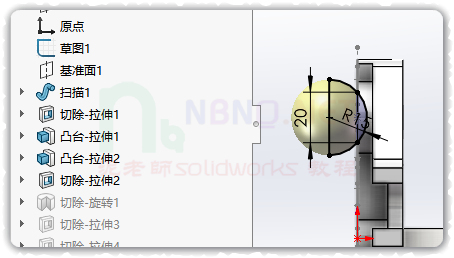 特别注意这个草图必须在那个面上。边线一边距离是20,另一边和半圆相切。这样才对哦。