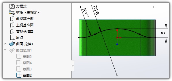 右视面绘草图,旋转凸台。将中间部位做出来。两个方向,分别成型到一点,选择填充曲面那里宽面上的那个R26两头的切点。
